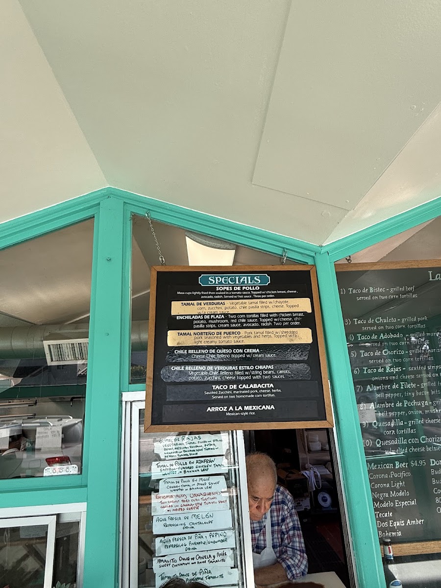 Besides tacos and main plates, the menu also features appetizers and accompaniments such as salsa, pico de gallo, chile con queso, and hummus. Traditional Mexican offerings include pozole, chile relleno with crema, chilaquiles, tamal de verduras, and rajas tacos. Beverages include options like watermelon water, which complement the food selections.