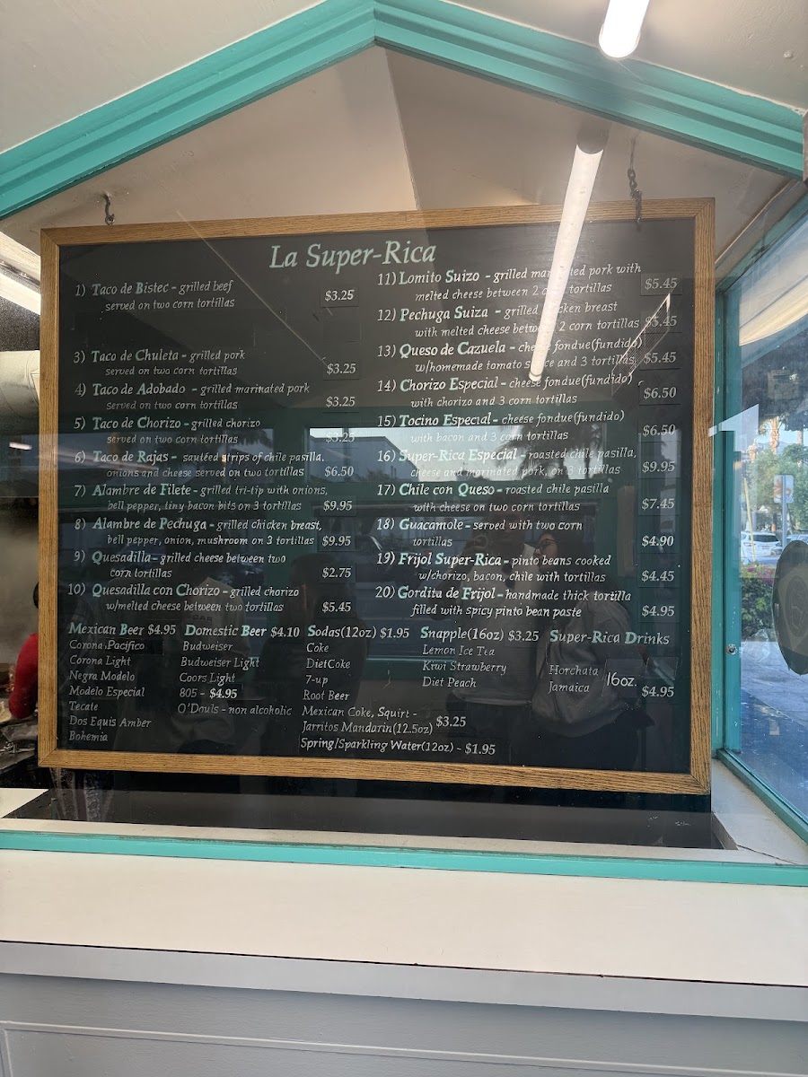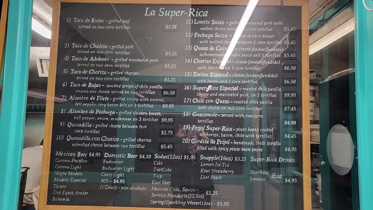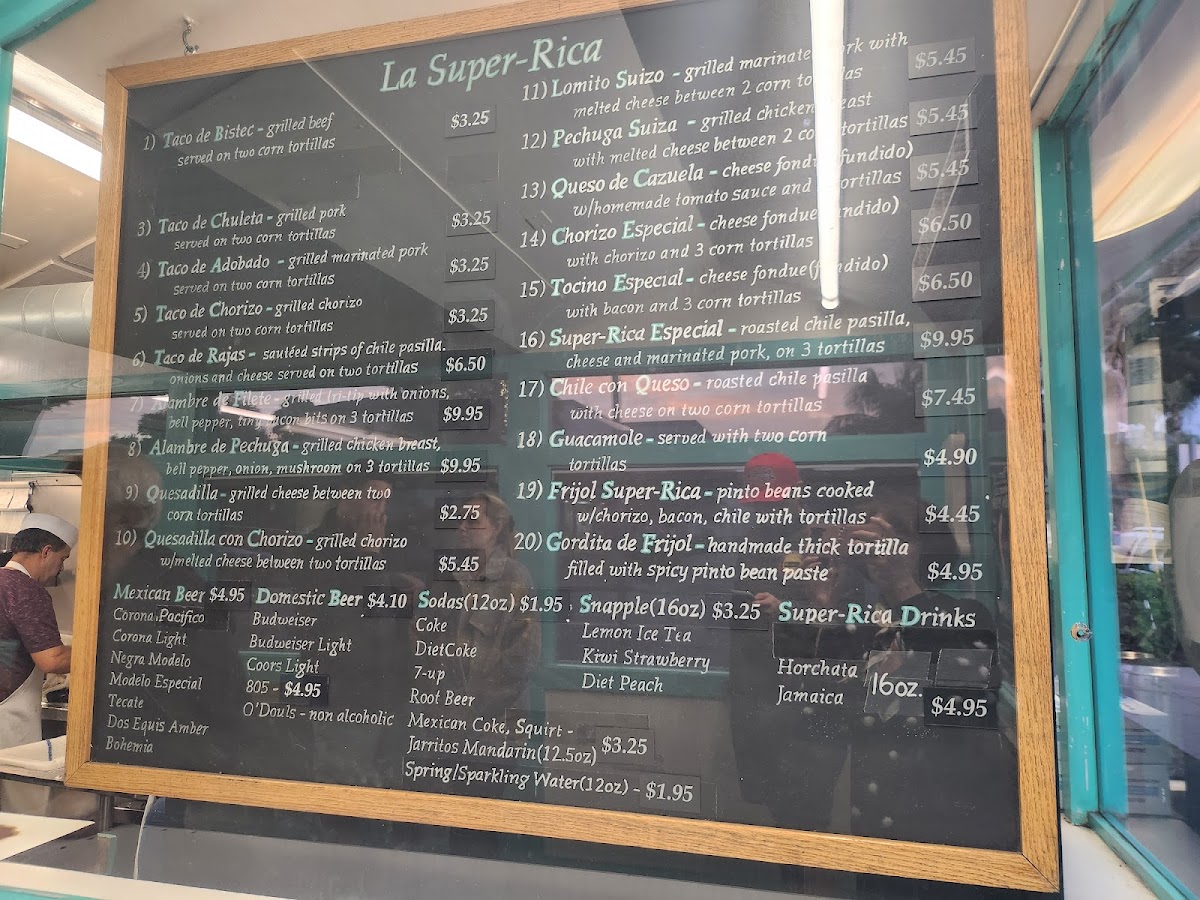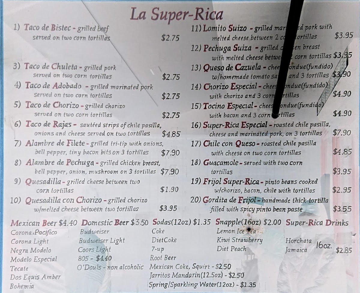 The menu at La Super-Rica Taqueria offers a variety of traditional Mexican dishes primarily centered around tacos and other classic specialties. The food selection includes several types of tacos made with different meats such as bistec (grilled steak), costilla (top round), chuleta (pork steak), and adobado (marinated pork steak), all served on homemade tortillas. Additional main dishes include favorites like carne asada tacos, alambre de pechuga (grilled chicken breast), chorizo quesadillas, chicken fajitas, and enchiladas.