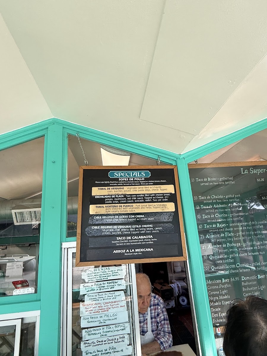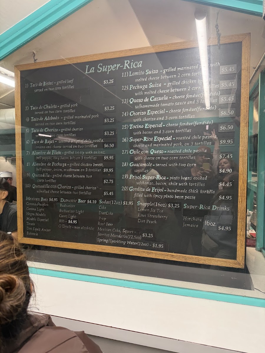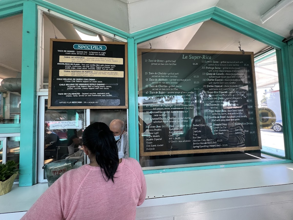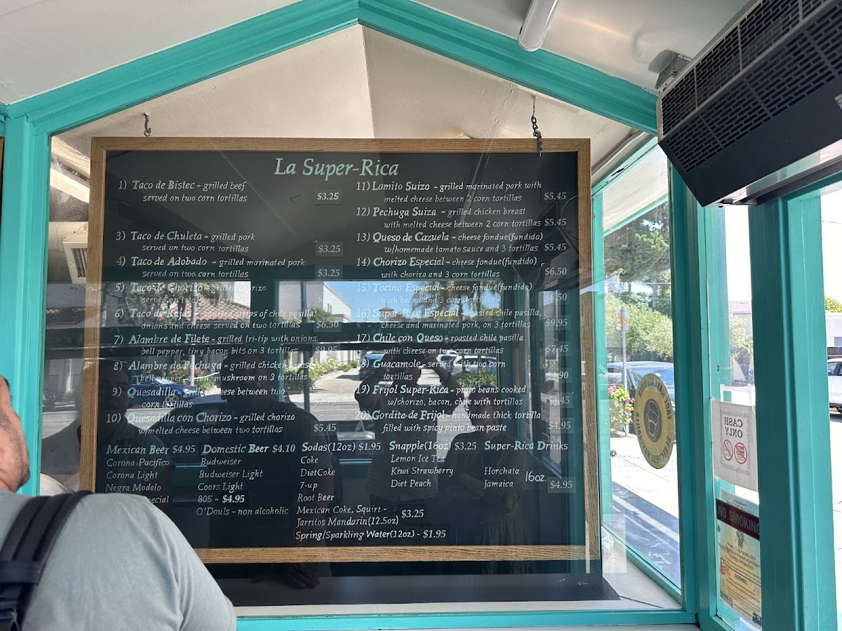 The menu at La Super-Rica Taqueria offers a variety of traditional Mexican dishes primarily centered around tacos and other classic specialties. The food selection includes several types of tacos made with different meats such as bistec (grilled steak), costilla (top round), chuleta (pork steak), and adobado (marinated pork steak), all served on homemade tortillas. Additional main dishes include favorites like carne asada tacos, alambre de pechuga (grilled chicken breast), chorizo quesadillas, chicken fajitas, and enchiladas.